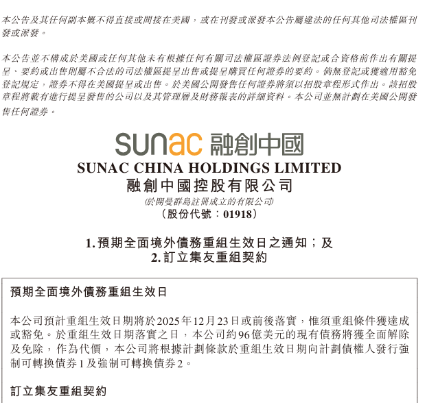 12月17日晚间,融创中国发布公告称,公司预计境外债重组生效日期将于2025年12月23日或前后落实,惟须重组条件获达成或豁免。于境外债重组生效日期落实之日,公司约96亿美元的现有债务将获全面解除及免除。作为代价,公司将根据计划条款在重组生效日期向计划债权人发行强制可转换债券1及强制可转换债券2。